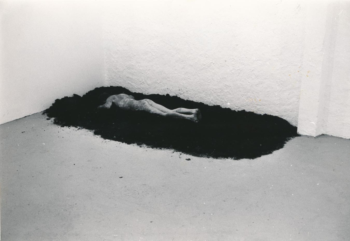 Description: The photo of the artist laying naked in some soft material like mold or soil. On the back of the picture there is inscription: Kristin Harðarson, performance page 24.