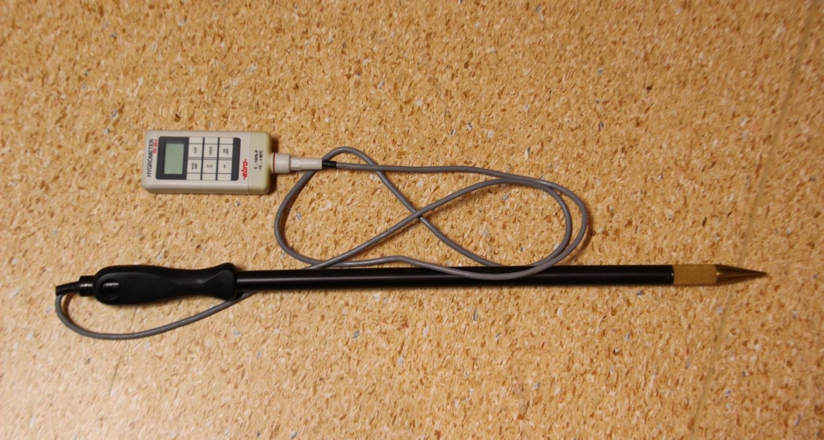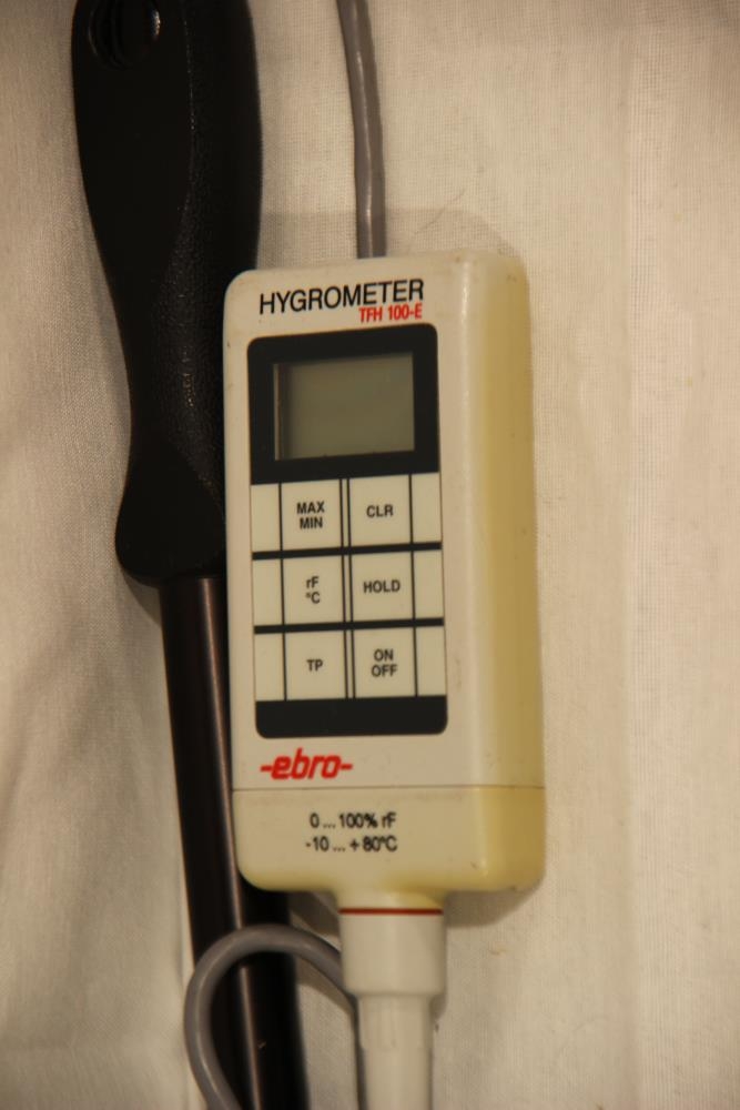 Hygrometer TFH 100-E. Mælirinn er grár með snúru sem er 150 cm. löng. Á enda snúrunnar er svört stöng með svörtu plasthaldi. Rakamælirinn er framleiddur í Þýskalandi.