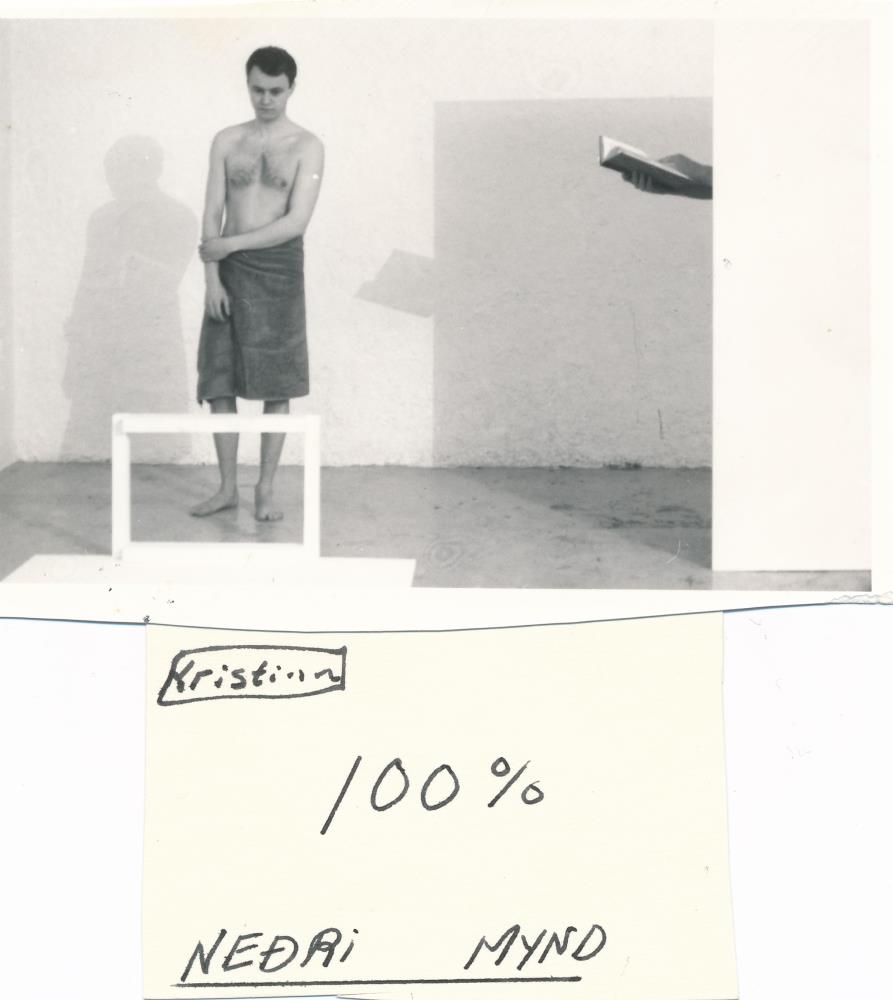 Description: 11x7,3 cm black&white photographs, snap-shot from a performance. The pictures show a scarecrow elephant-shaped inside a box which forms a triangle. (see photo). Behind this, we can see a naked body lying prone on some black material, maybe soil or mud. Two photos show different sides of the performance. Two hands holding up a book and a standing man with a towel around his hips.