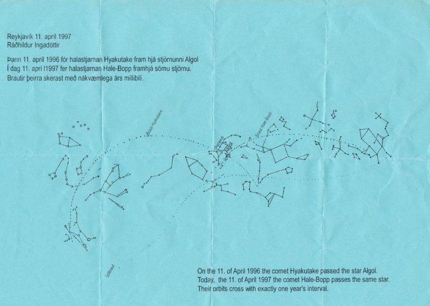 Description: A4 blue paper sheet titled "Reykjavík 11. apríl 1997. Ráðhildur Ingadóttir". On the paper there are the draw of some constellations and a written explanation at the top (Icelandic) and at the bottom (English).