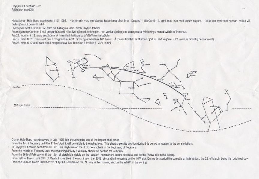 Description: A4 paper sheet titled "Reykjavík 1. febrúar 1997. Ráðhildur Ingadóttir". On the paper there are the draw of some constellations and a written explanation at the top (Icelandic) and at the bottom (English).