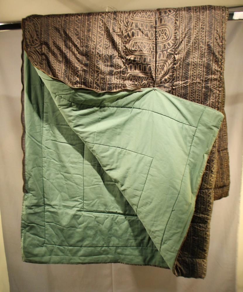 Svefnpokinn er tvílitur; drapplitur með svörtu munstri og með rennilás á hlið. Yfirborðið er nælon en grænt bómullarfóður. Fyllingin er ullarkemba.