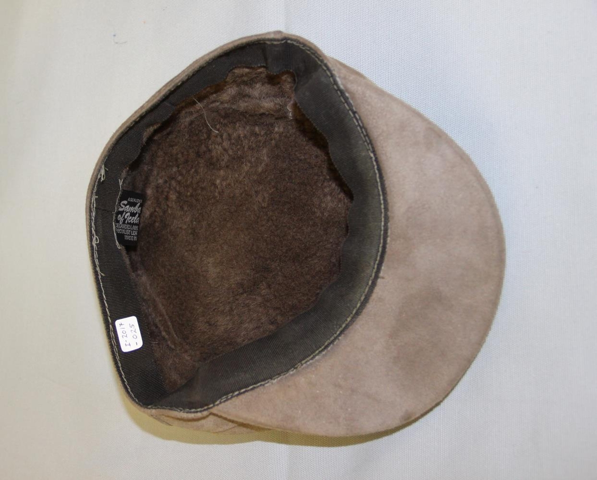Mokkahúfan er brún með skyggni. Innan í húfunni er ísaumaður miði með texta: Samband of Iceland - ásamt leiðbeiningum um hreinsun.