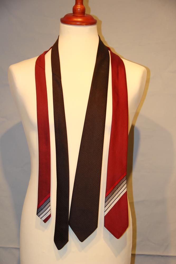 Hálsbindin á mynd 1: Annað rautt með röndum, hitt brúnt með röndum. Áletrun: Lexa Iceland