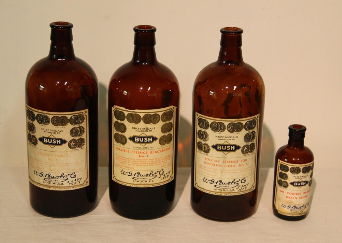 Flöskurnar fjórar eru brúnar með áprentuðum texta og innihéldu bragðefni. Bragðefnin voru: Hunang (honey), brómber (Blackberry), kólagos (sparkling cola) og Koníak brandý olía (Oil cognac brandy green super). Stærð: Þrjár flöskur eru 10x26 cm. og ein er 5x13 cm.