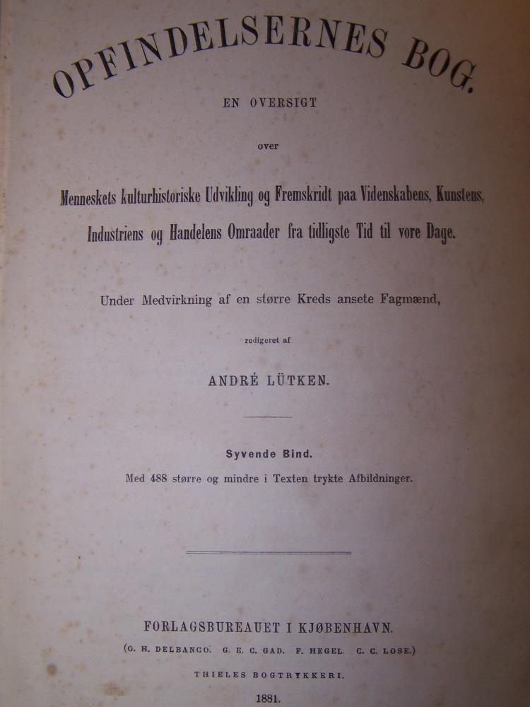 Bók úr búi Benedikts Kristjánssonar á Grenjaðarstað. Komu 7 saman úr sömu ritröð. Opfindelsernes bog, Forlagsburautet i Kjobenhavn. Sonur Benedikts Kristjánssonar, Kristján Benediktsson gullsmiður gaf Gunnari Þór bækurnar. Sjöunda bindi.
