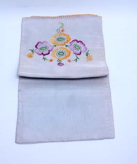 Fölblár renningur úr skilkiefni. Tvöfaldur en saumaður saman á öllum köntum. Á annarri hliðinni og bara á öðrum endanum eru 4 útsaumuð blóm, gul og fjólublá og í kantinum þeim megin er gulur útsaumur. Hlutverk óþekkt.