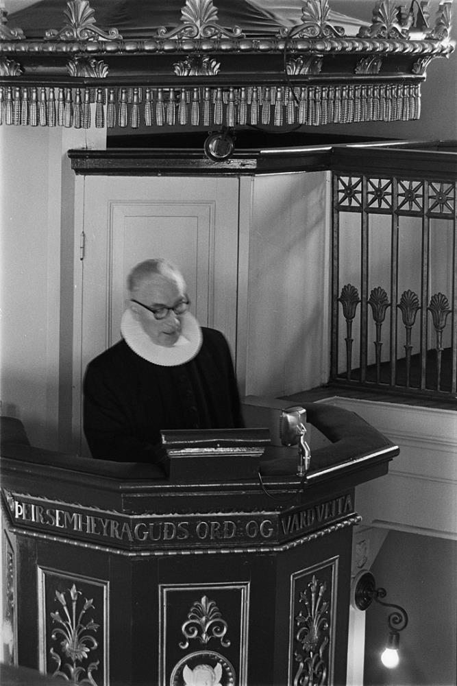 Tekið í dómkirkjunni. Prestur stendur í predikunarstól.