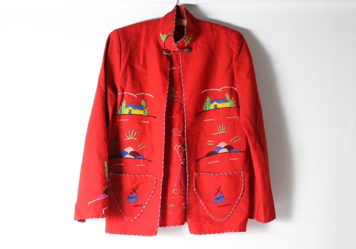 Ruður útsaumaður jakki með standkraga á konu. Jakkinn er heimasaumaður og allur útsaumuðum með marglitu ullargarni. Á kraganum eru þrjár myndir. Kraginn er frekar hár og eru þrjár myndir á honum og ekki ætlast til að hann sé brotinn út á axlir. Hneppsla er við hálsmálið og eru tveir hnappar sitthvoru megin og ein flétta til að loka hálsmálinu sem er úr sama efni og jakkinn. Pálína hefur saumað þessa flík sjálf eða móðir hennar.