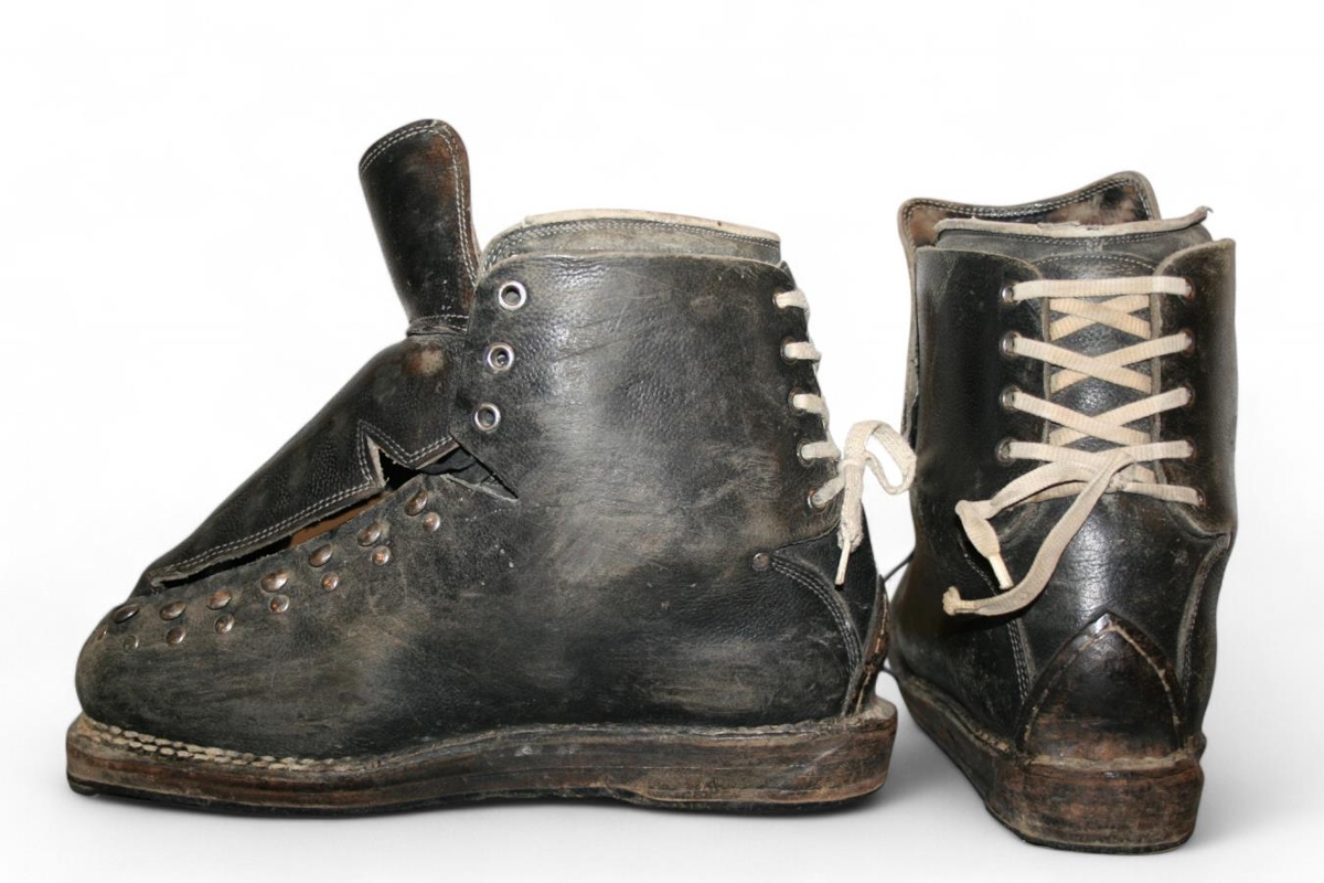 Svartir skíðaskór. Reimaðir, þykkir skíðaskór með reimum að aftan til að halda þeim stífum að fæti.