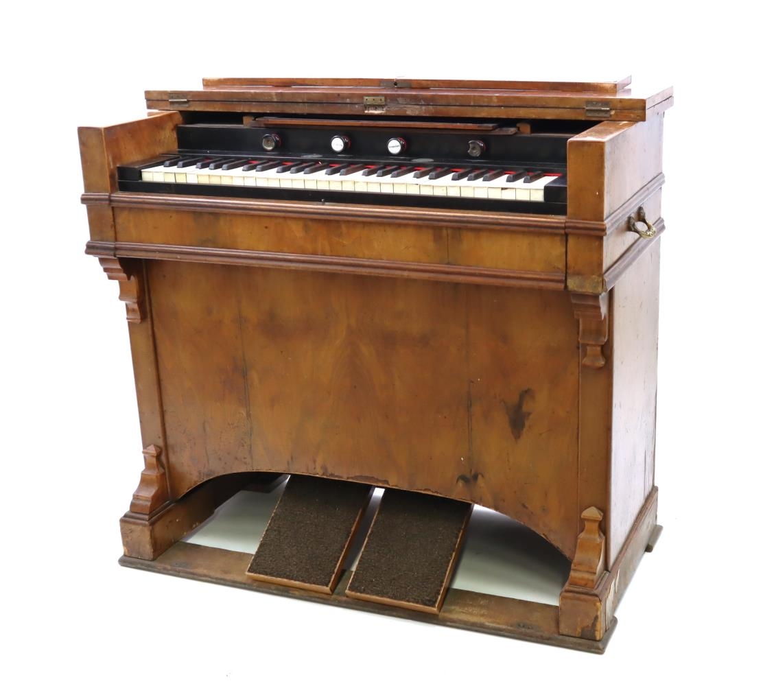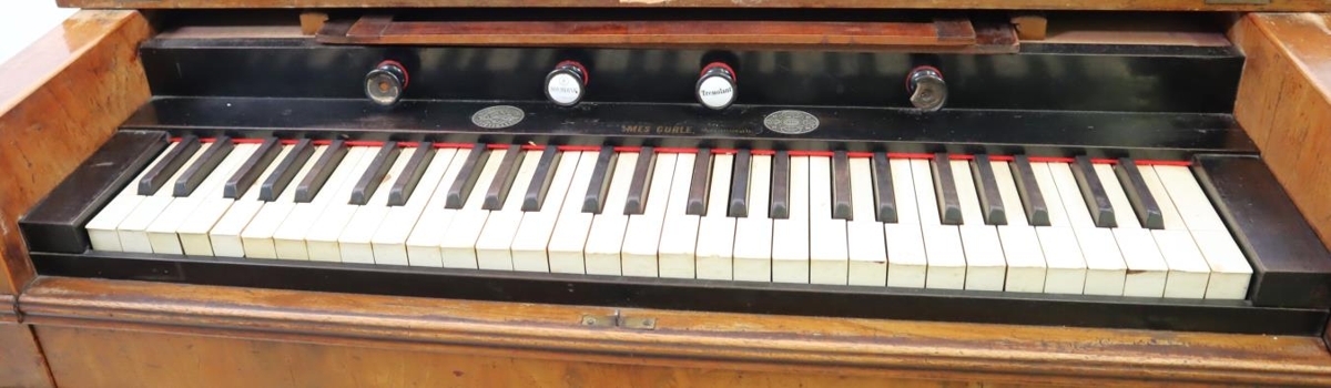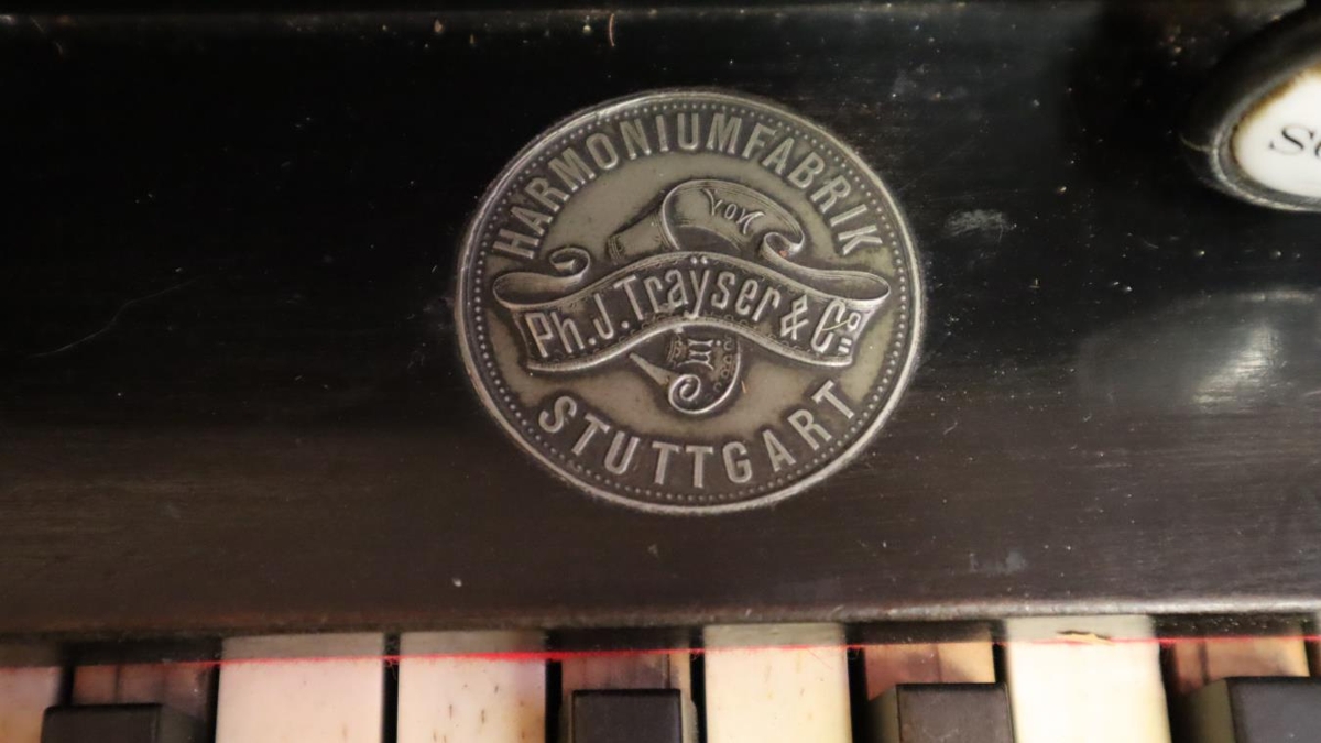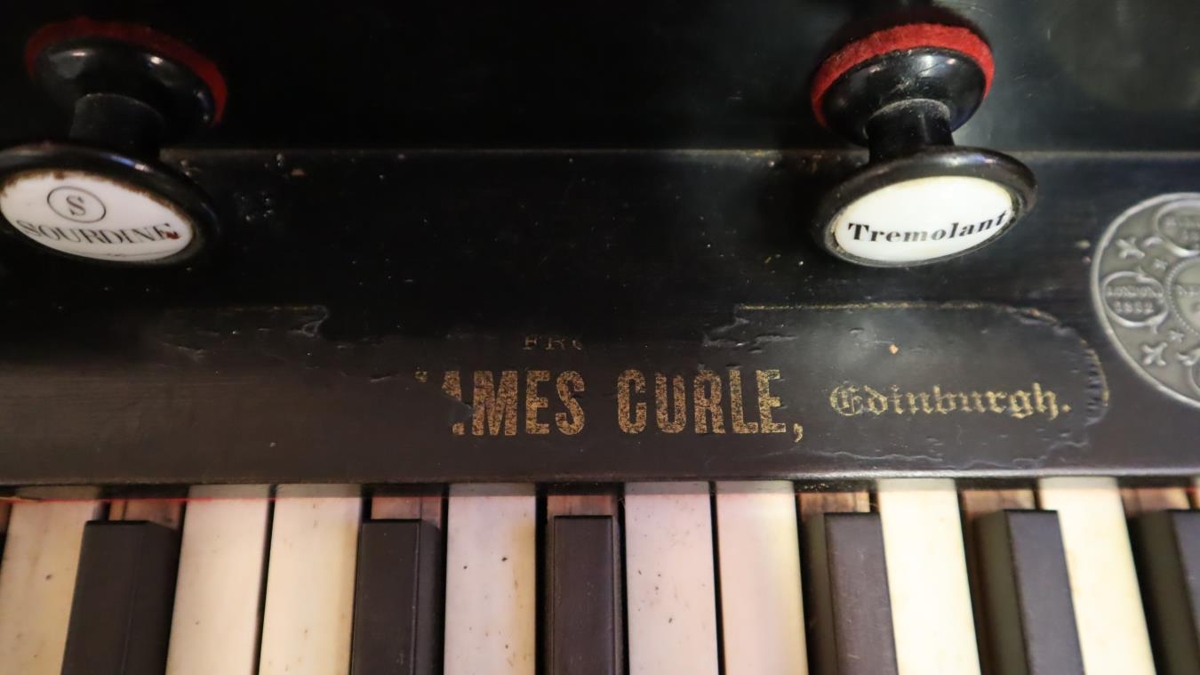 Pumpuorgel með tveimur pedulum. Hljóðstillingar eru 4 takkar út - inn dregnir. Gyllt handföng á hliðum. Lok á orgeli leggst saman ofan á því. Áletrun með gylltu letri, nokkuð afmáð: "James Curle, Edinburgh" Tveir smáir skildir úr málmi eru ofan við nótnaborð með áletrunum: "Munchen 1854, London 1862, New York 1853, Paris 1867, Stettin 1868" og "Harmoniumfabrik von Ph.J. Trayser & Co Stuttgart".