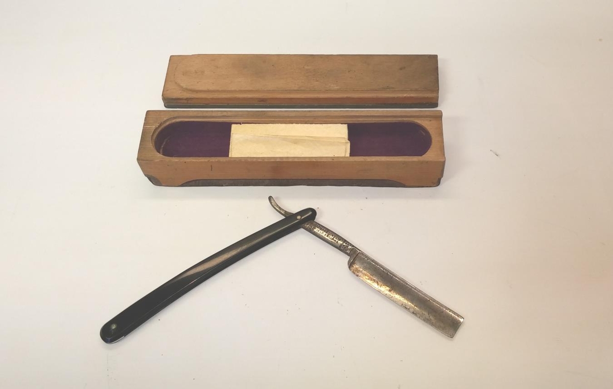 Rakhnífur, skaft úr svörtu harðplasti. Lengd 24 sm. Hulstur úr tré og í hulstrinu er að finna reikning frá S. Kristjánsson á Eyrarbakka til Ólafs Guðjónssonar 31.7.1956.