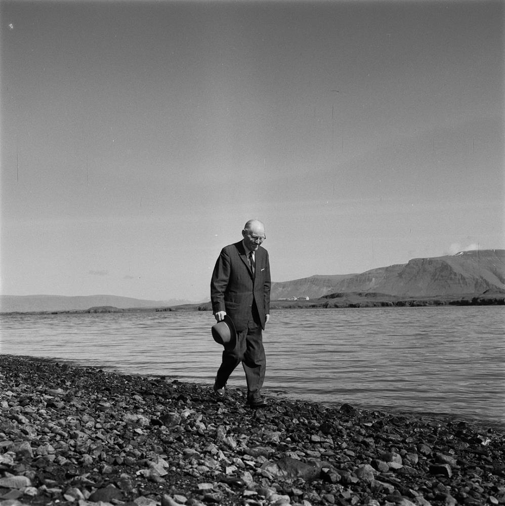 Karlmaður gengur í fjöru, hann heldur á hattinum sínum.