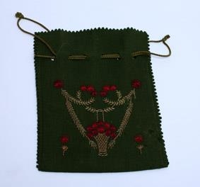 Grænn poki með útsaumuðu blómamunstri. Blómin eru rauð en vasi og blómsveigur með brúnlitum þræði. Pokinn er úr einhverskonar filt efni með riffluðu munstri á köntum. Grænt band að ofan til að draga pokann saman.