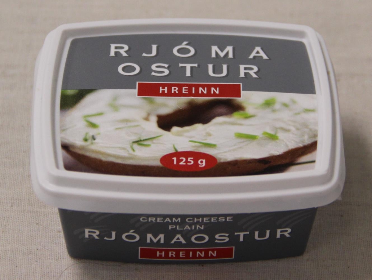 Plastbox undan smurosti. Það er grátt með hvítum texta: Rjómaostur - hreinn - 125 g.