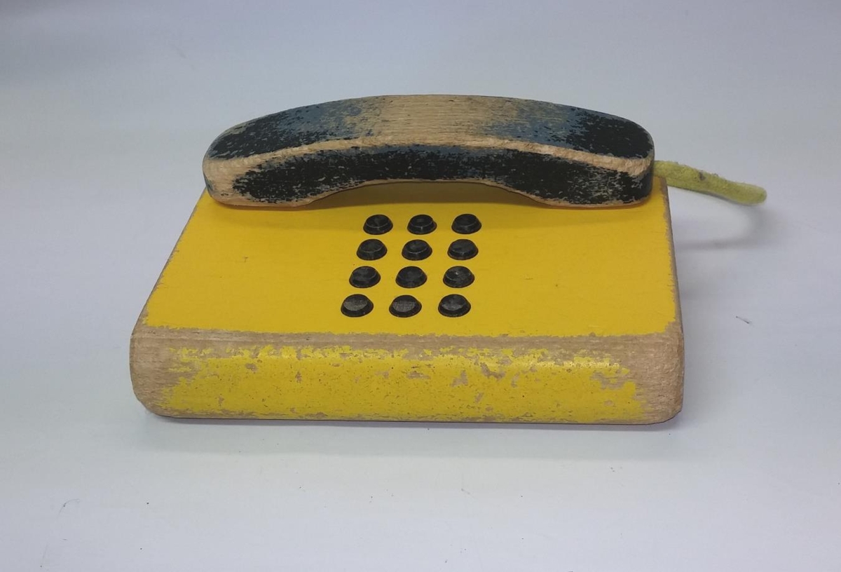 Leikfangasími úr tré. Gulmálaður með svörtu tóli, snjáður.