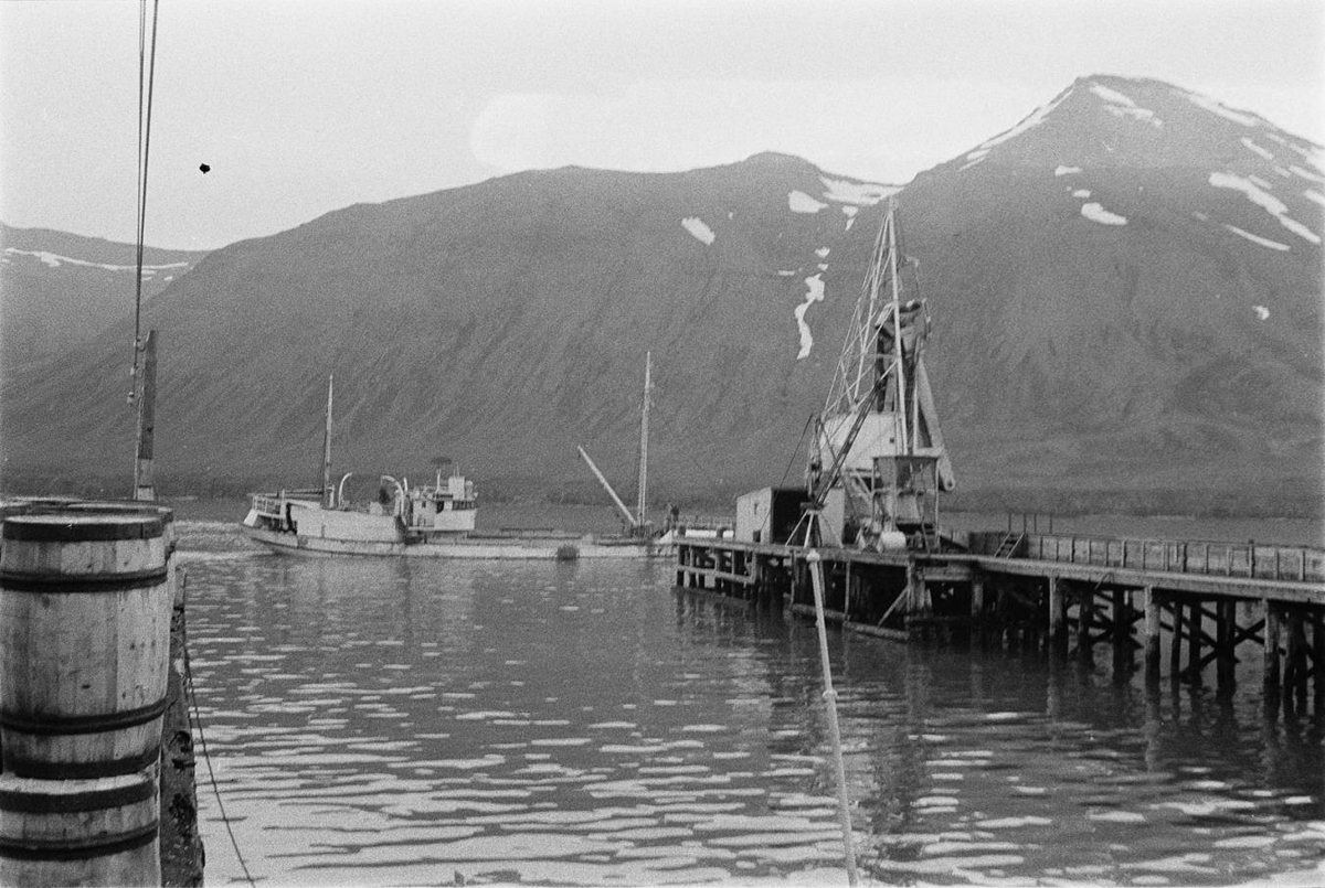 Síldarbátur kemur að bryggju til löndunar. Löndunarfæriband á bryggjunni. Tunnur á bryggjunni.