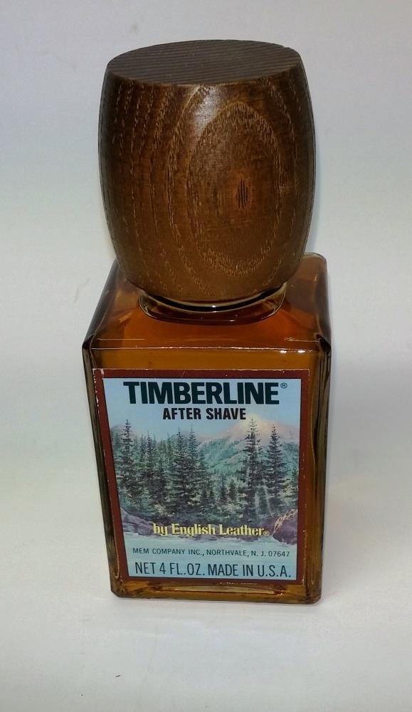 Flaska af rakspíra, vörumerki "TIMBERLINE AFTER SHAVE by English Leather". Gler og tappi úr tré.