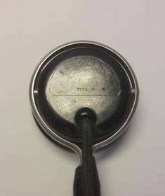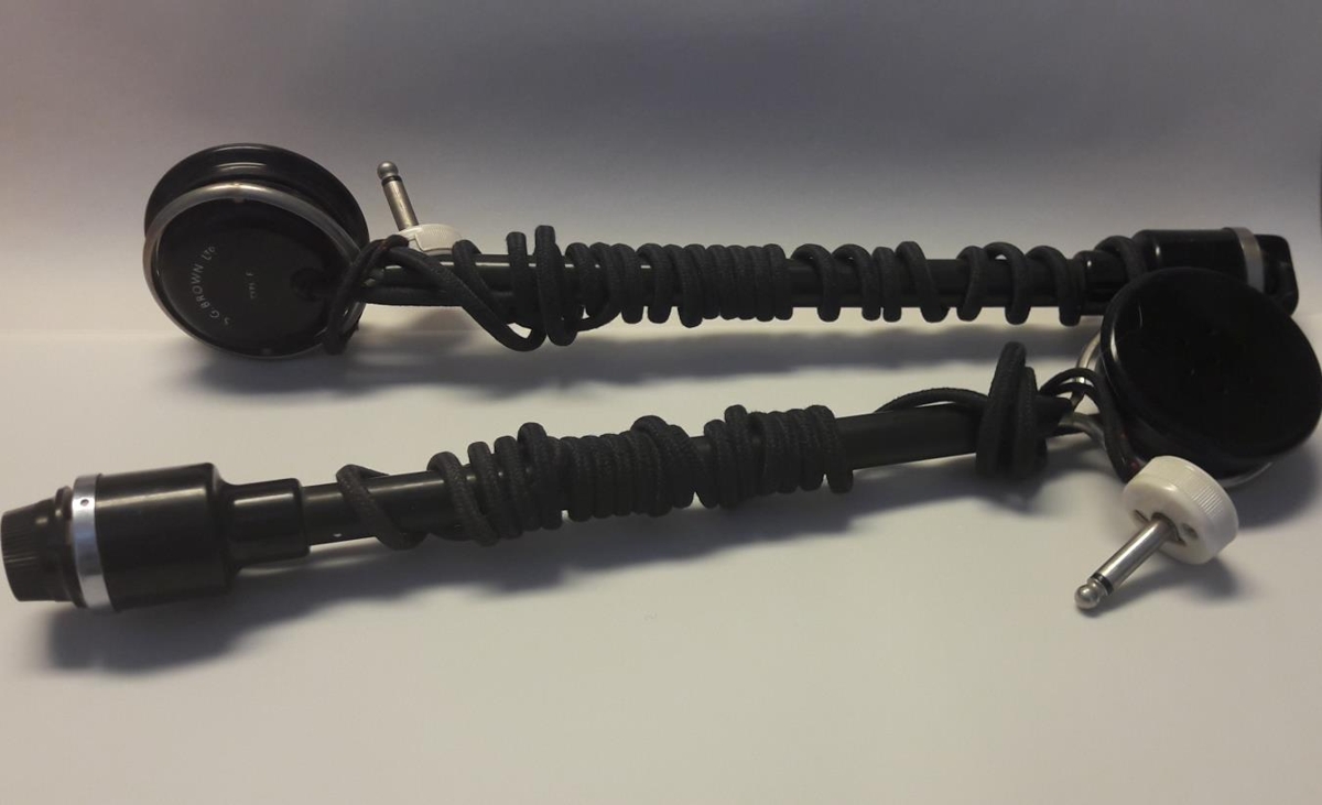 Tvö heyrartól úr Fríkirkjunni í Hafnarfirði framleidd af S.G. Brown LTD í Watford, Englandi, gerð F. Heyrnartólin eru þannig að hátalari er efstur, svo kemur um 20 cm langt handfang, svo snúra til þess að tengja þau og loks snúningshnappur á botninum sem ræður styrki hljóðs.