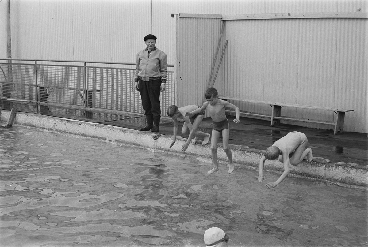 Drengir í sundkennslu. Þrír drengir stinga sér í laugina. Karlmaður, líklega kennari, stendur á bakkanum.