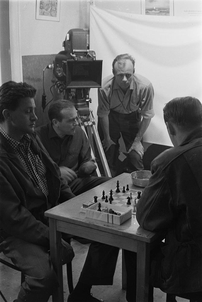Kvikmyndagerð. Tveir karlmenn sitja við borð og tefla skák. Tveir aðrir menn eru hjá kvikmyndatökuvél.