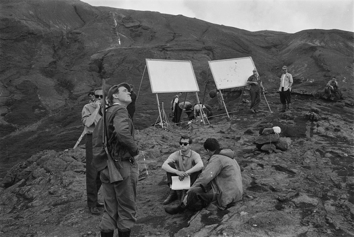 Kvikmyndagerð. Karlmenn vinna að kvikmyndagerð úti í náttúrunni. Kvikmyndagræjur standa á grjótklöppum. Í forgrunni standa tveir karlmenn, annar er með haglabyssu á bakinu, og tveir menn sitja á grjótinu, annar heldur á blöðum.