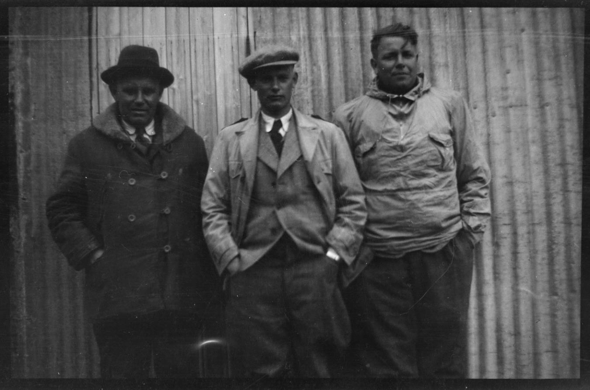 Þrír menn standa undir húsvegg. Frambjóðendur við vorkosningarnar 1942. F.v. Steingrímur Steinþórsson F, Albert Guðmundsson Sós, Helgi Hannesson A. Á myndina vantar Gísla Jónsson S. Myndin er tekin við fundarhúsið í Neðri-Gufudal.