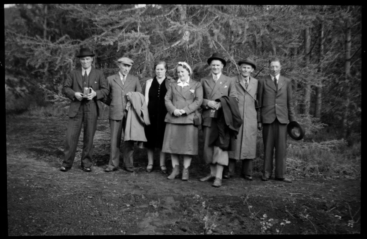 Uppstilltur hópur af ferðafólki í skógi. Lengst til hægri er Halldór Kristjánsson. Tekið í bændaferð um Norður- og Austurland 1945.