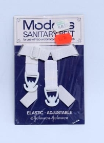 Dömubindahaldari í upprunalegum umbúðum óopnuðum. Framleiðandi Johnson&Johnson. Verðmiði er á umbúðunum, kemur úr Stjörnuapóteki og hefur kostað 68 kr. Á spjaldinu sem teygjan er fest á stendur : Mode()s Sanitary Belt for use with tab-end or looped sanitary towels. Elastic - Adjustable. Johnson and Johnson.