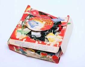 Jólasería í upprunalegum umbúðum sem eru orðnar mjög illa farnar. Rifinn pappakassi, rauður með grænum stöfum. Límdur saman með límbandi þar sem hann er rifinn. Á kassanum stendur Sunshine. Illuminated Decoration Bells. Decoration Lighting Set. 200/250 volts. Made in England.