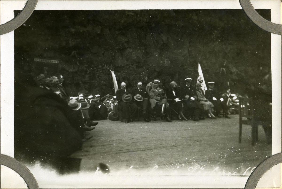 Frá Alþingishátíðinni á Þingvöllum 1930. Erlend fyrirmenni og ráðherrar í sætum sínum á þingpallinum í Almannagjá. Frá vinstri: Matthías Þórðarson þjóðminjavörður, Magnús Sigurðsson bankastjóri, Gústaf VI Adolf þá Svíaprins, Alexandrína drottning Danmerkur, Kristján X. konungur Danmerkur, frk. Schested hirðmær, Jón Sveinbjörnsson konungsritari.