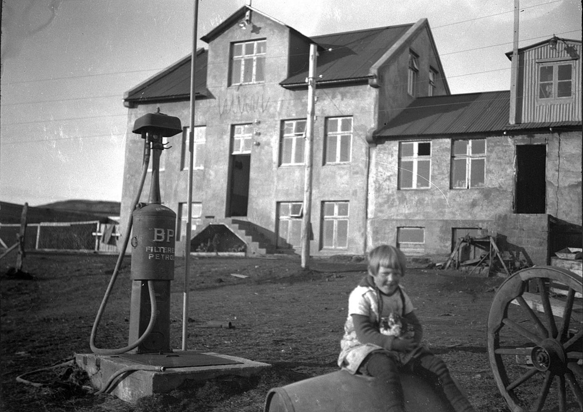 Inga Þórarinsdóttir situr á olíutunnu við olíudælu framan við Hólm í Landbroti.