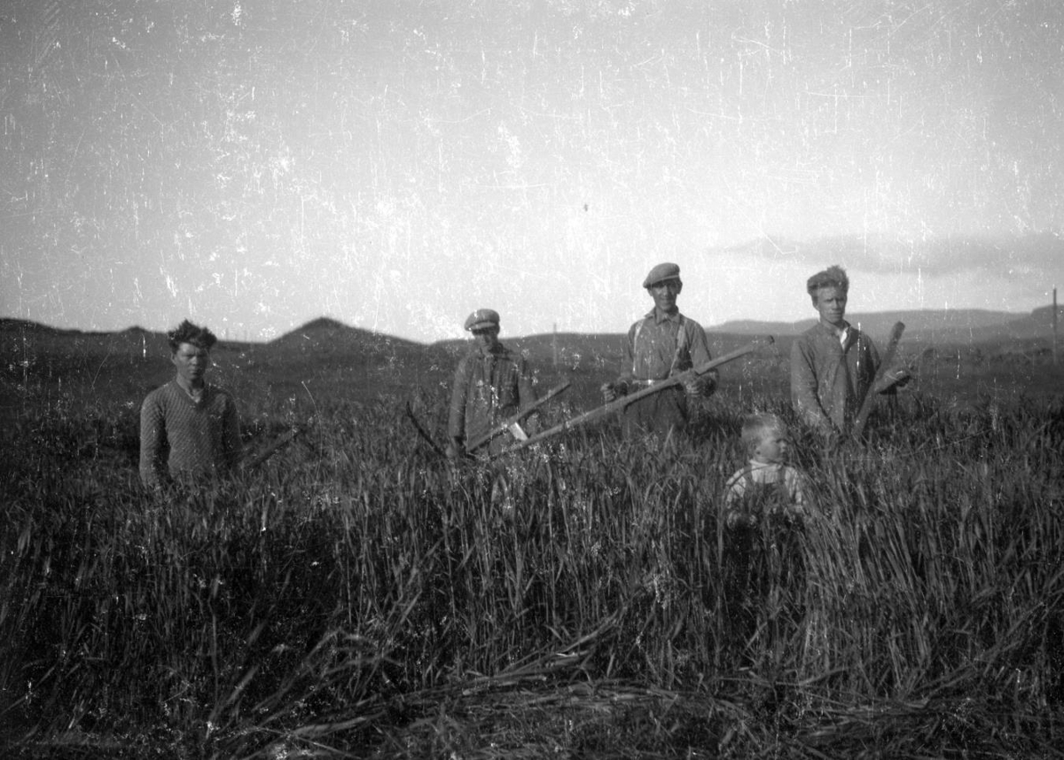 Sláttumenn á túninu í Hólmi í Landbroti. Valdimar Runólfsson er annar frá hægri. Litli drengurinn er að öllum líkindum Helgi Valdimarsson.