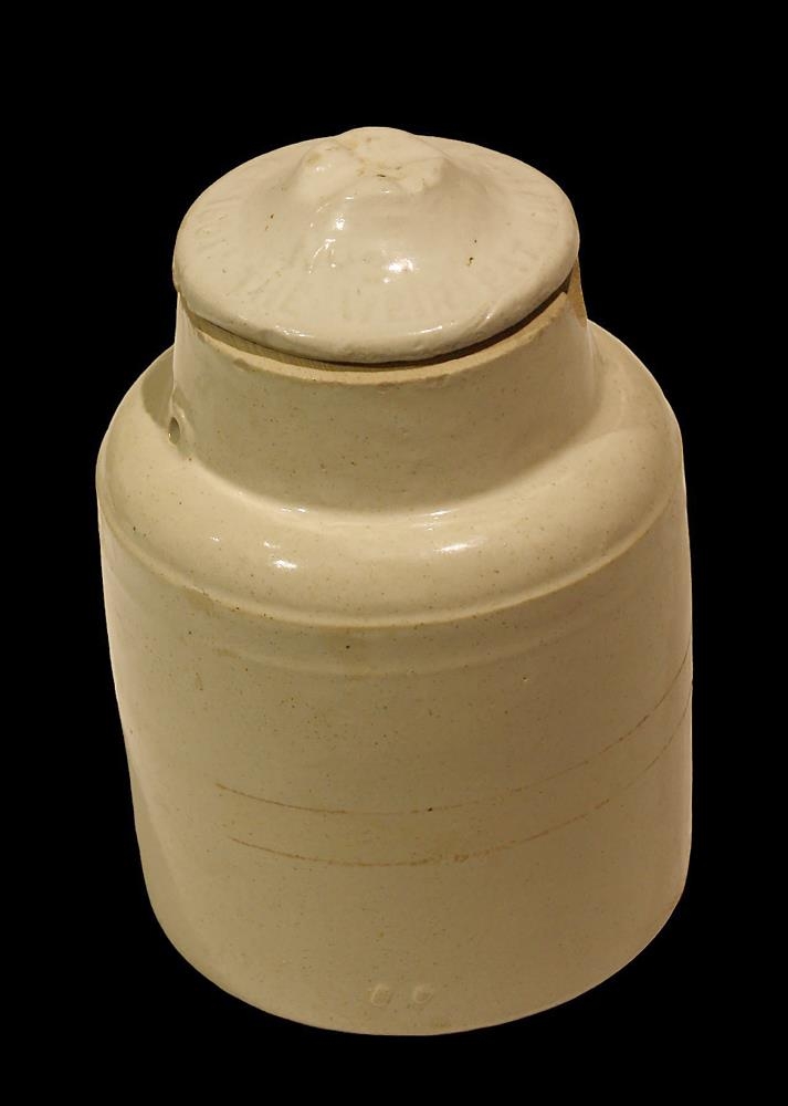 Krukkan er með loki og er úr ljósum leir. Uppruni óþekktur.