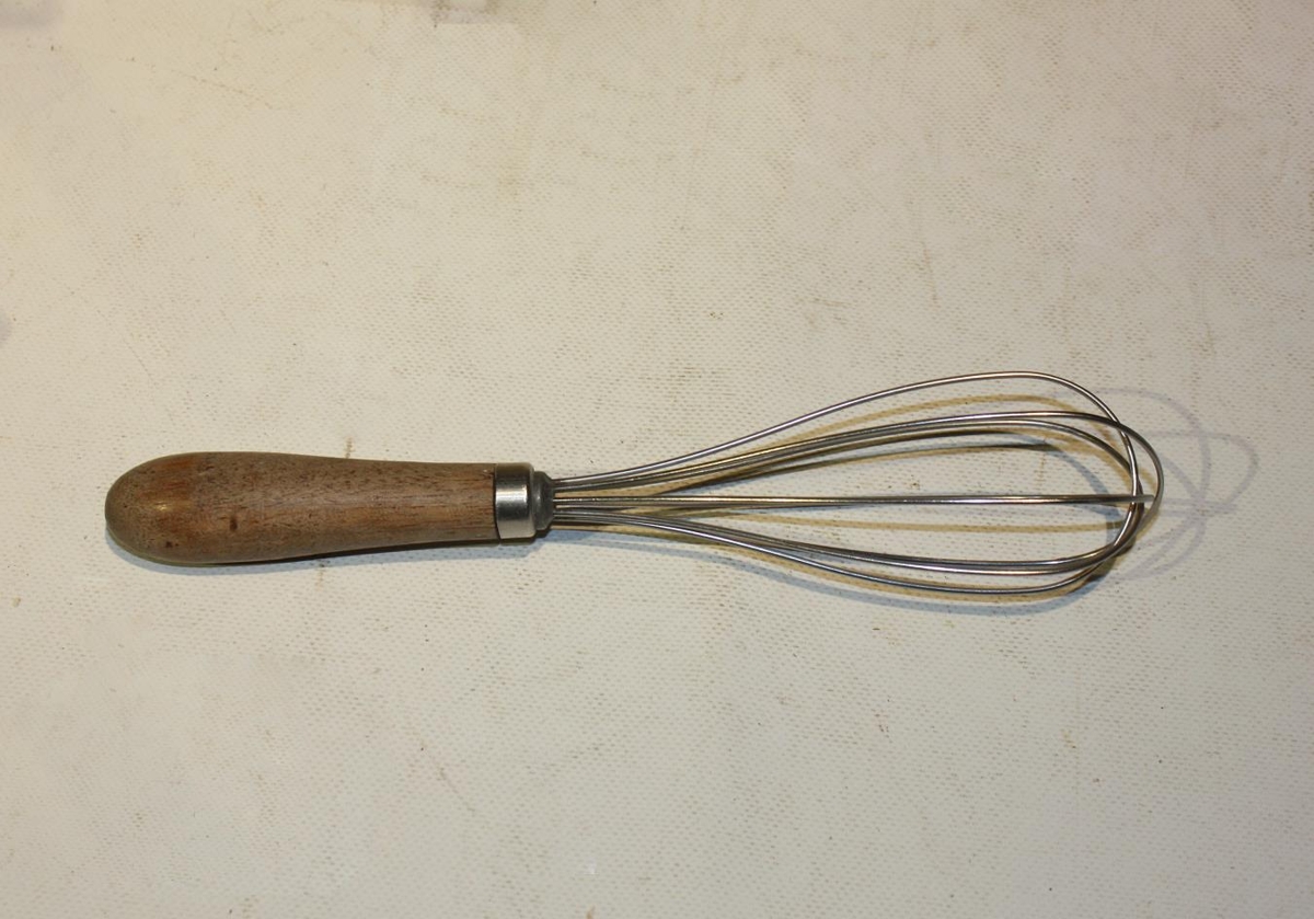 Eldhúsáhöld: buffhamar, kartöflustappari, tvö kökukefli, kleinujárn og pískari með tréhandföngum