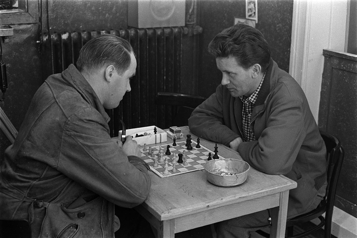 Tveir karlmenn sitja við borð og tefla skák. Annar heldur á pípu en hjá hinum liggur sígarettupakki og eldspýtnastokkur. Öskubakki er á borðinu.