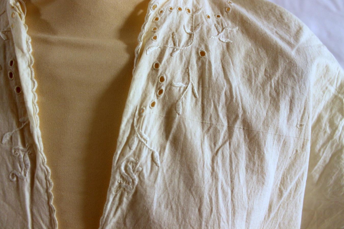 Náttkjóll Ingibjargar Sigurðardóttur, Kirkjubóli. Handsaumað af Ingibjörgu Ólafsdóttur, stjúpu Guðmundar Böðvarssonar, í tilefni af giftingu hans og Ingibjargar, 25. júlí 1931.
