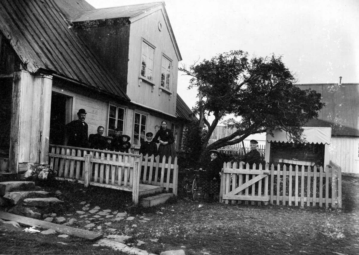 "Út úr þessu húsi flýði Jón gamli Borgfirðingur í brunanum mikla 1901. Á myndinni eru börn hans: Finnur Jónsson, lengst til vinstri, og Guðný. Við hlið Guðnýjar er Þorbjörg, eigikona Klemensar og situr sennilega undir dóttur þeirra hjóna, Karen Emilíu. Guðrún styður olboga á öxl föður síns Jóns Borgfjörð. Anna eldri dóttir Klemensar og Þorbjargar, heldur í stýri á þríhjólinu. Drengurinn lengst til hægri er líklega sonur Finns en myndin er tekin þegar þeir koma til Íslands árið 1897."