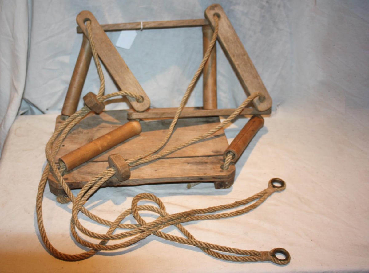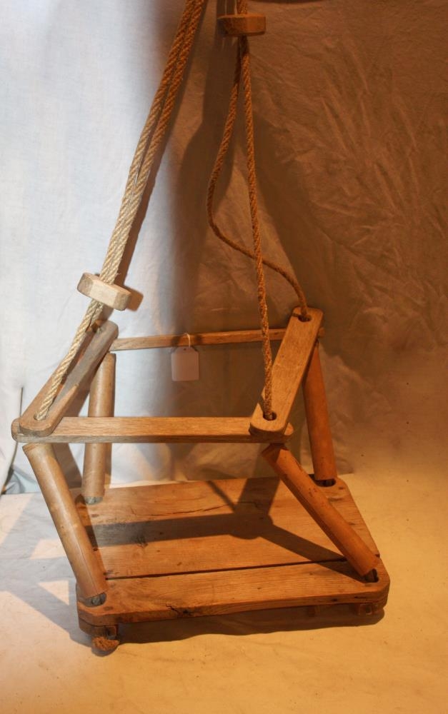 Barnaróla sem hengd var í dyrastafi innanhúss. Rólan er gerð úr nokkrum trébútum sem þræddir eru saman með snæri og leggst hún saman ef hún er ekki í notkun.