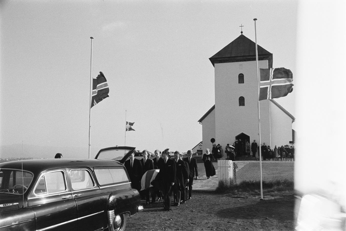 Tekið fyrir utan Bessastaðakirkju. Flaggað er í hálfa stöng á þremur flaggstöngum. Líkbíllinn stendur fyrir utan kirkjuhliðið. Fólk gengur úr kirkjunni. Kistuberar koma með kistuna að líkbílnum. Prestur gengur á eftir. Lögregluþjónar standa heiðursvörð.