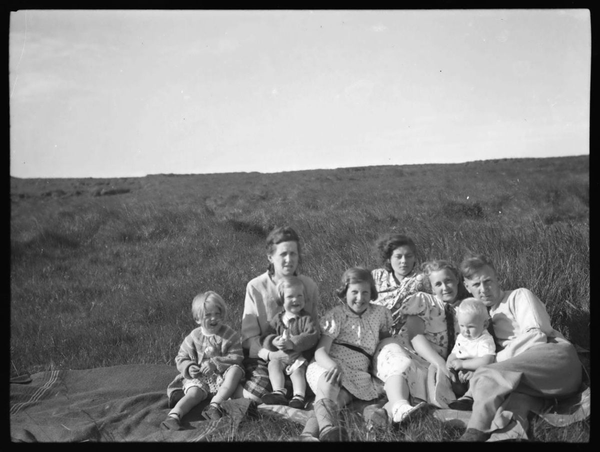 Hópur fólks, fullorðnir og börn í graslendi. Jakobína eiginkona Jóns önnur frá vinstri væntanlega með barnabarn hægra megin við sig og í fanginu. Sigþrúður dóttir hennar næst. Lengst til hægri er væntanlega sonur Jóns með barn og eiginkonu.