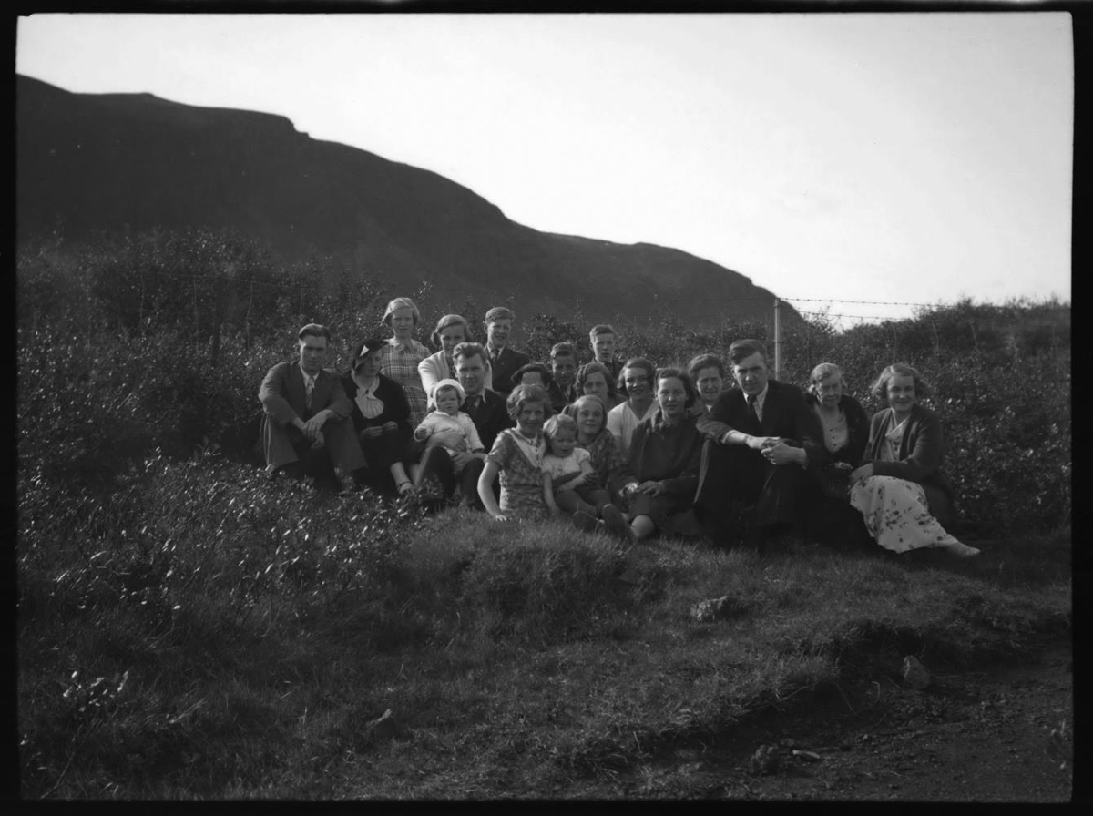 Hópur fólks utandyra, börn og fullorðnir. Væntanlega fjöskylda Jóns Björnssonar, Jakobína eiginkona Jóns fjórða frá hægri.