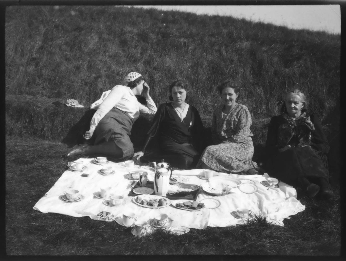 Fjórar konur sitja í grasi með torfgarð/vegg fyrir aftan sig. Dúkur á jörðinni fyrir framan þær. Jakobína eiginkona Jóns önnur frá hægri.