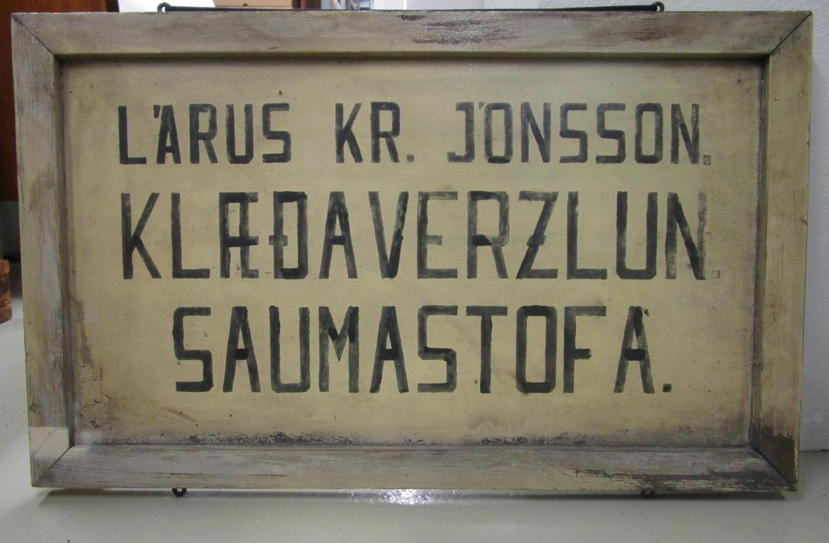 Auglýsingaskilti sem Lárus Kristinn Jónsson klæðskeri í Stykkishólmi notaði til að auglýsa starfsemi sína. Í bréfi sem fylgdi skiltinu segir: Skiltið mun hafa verið á Norska húsinu þar sem var saumastofa Kaupfélags Stykkishólms en Lárus Kristinn starfaði þar. Það var einnig á Möllers apóteki þar sem Lárus Kristinn var með eigin rekstur og á húsi Eyjólfs Ólafssonar og Kristrúnar Ísleifsdóttur við Aðalgötu 21 þar sem góðborgarinn Lárus Kristinn Jónsson hafði aðstöðu og starfaði sem klæðskeri í kjallaranum. Hann var síðar húsvörður Grunnskólans í áratugi. Skiltið er víðförult því til Norska hússins - BSH kom það frá San Jose í Kaliforníu. Skiltið er í breiðum tréramma.