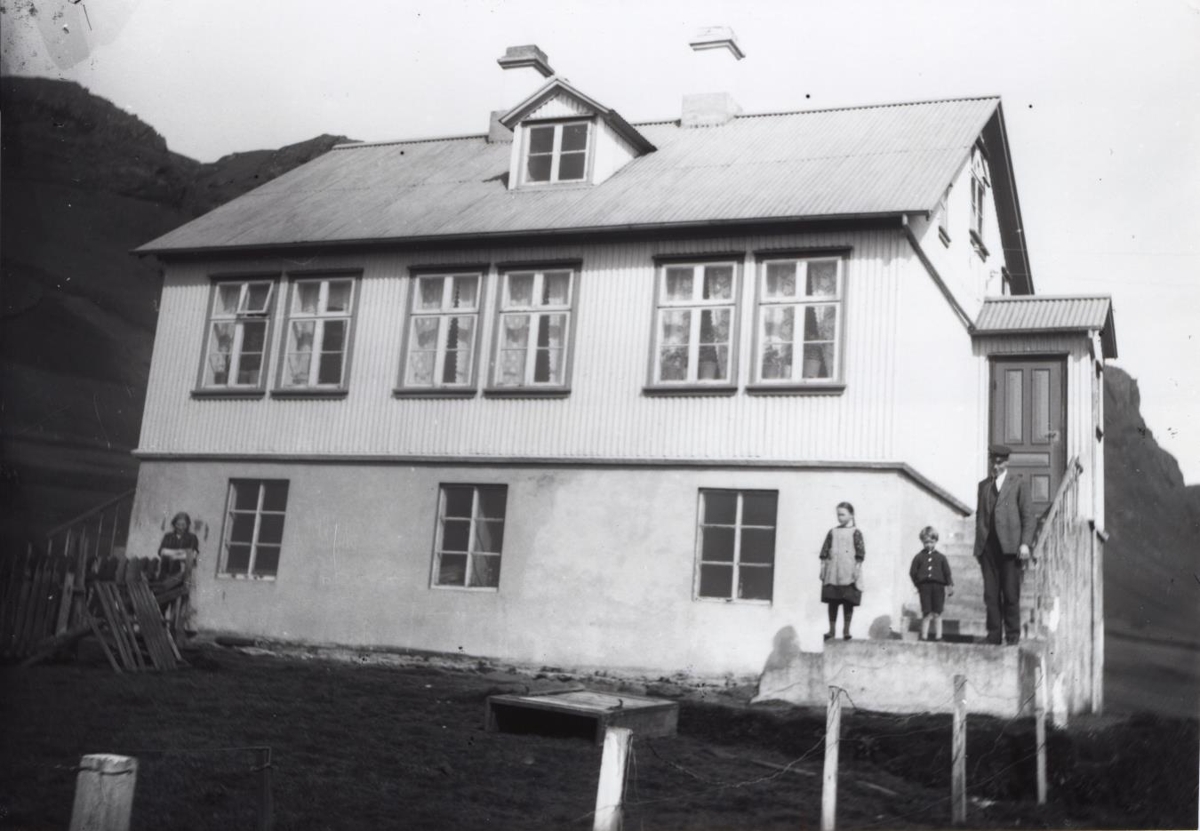 Á myndinni er Erlendur ásamt tveimur börnum fyrir framan húsið Grund.