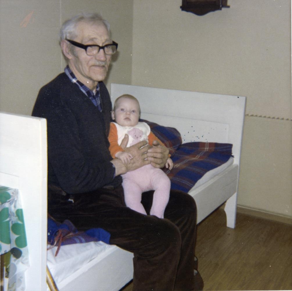 Sigurður Guðmundsson (1888-1982) bóndi á Kolsstöðum brosleitur með nýja kynslóð, hana Kristínu Amelíu Þuríðardóttur, barnabarn Bergs, sonar Sigurðar.