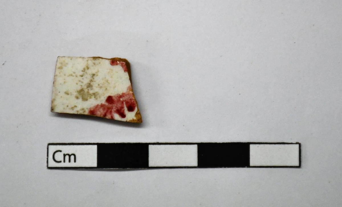 Leirkersbrot með hvítum glerung og bleiku skrauti á annarri hliðinni. En einungis smá leifar af hvítum glerung á hinni hliðinni.