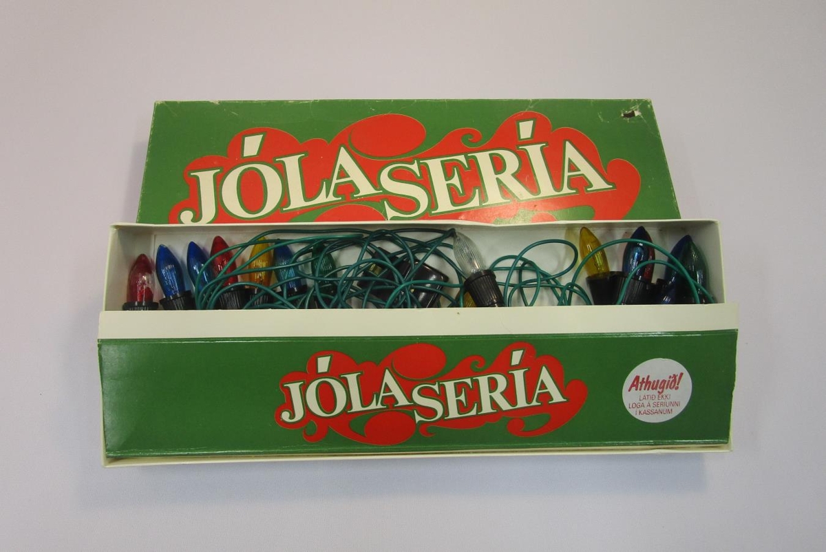 Jólasería úr búi Kristínar Níelsdóttur og Höskuldar Pálssonar. Þetta er 18 ljósa sería og er trúlega búið að skipta um flestar perurnar. Á seríunni er plastmerki sem á stendur: 220 v. 18x3 w GERÐ: E10SH S. HJARTARSON.