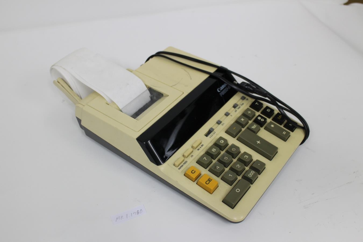 Rafmagnsreiknivél. Ljósdrapp og grá á lit. Með litlum skjá og strimplaprentara.
