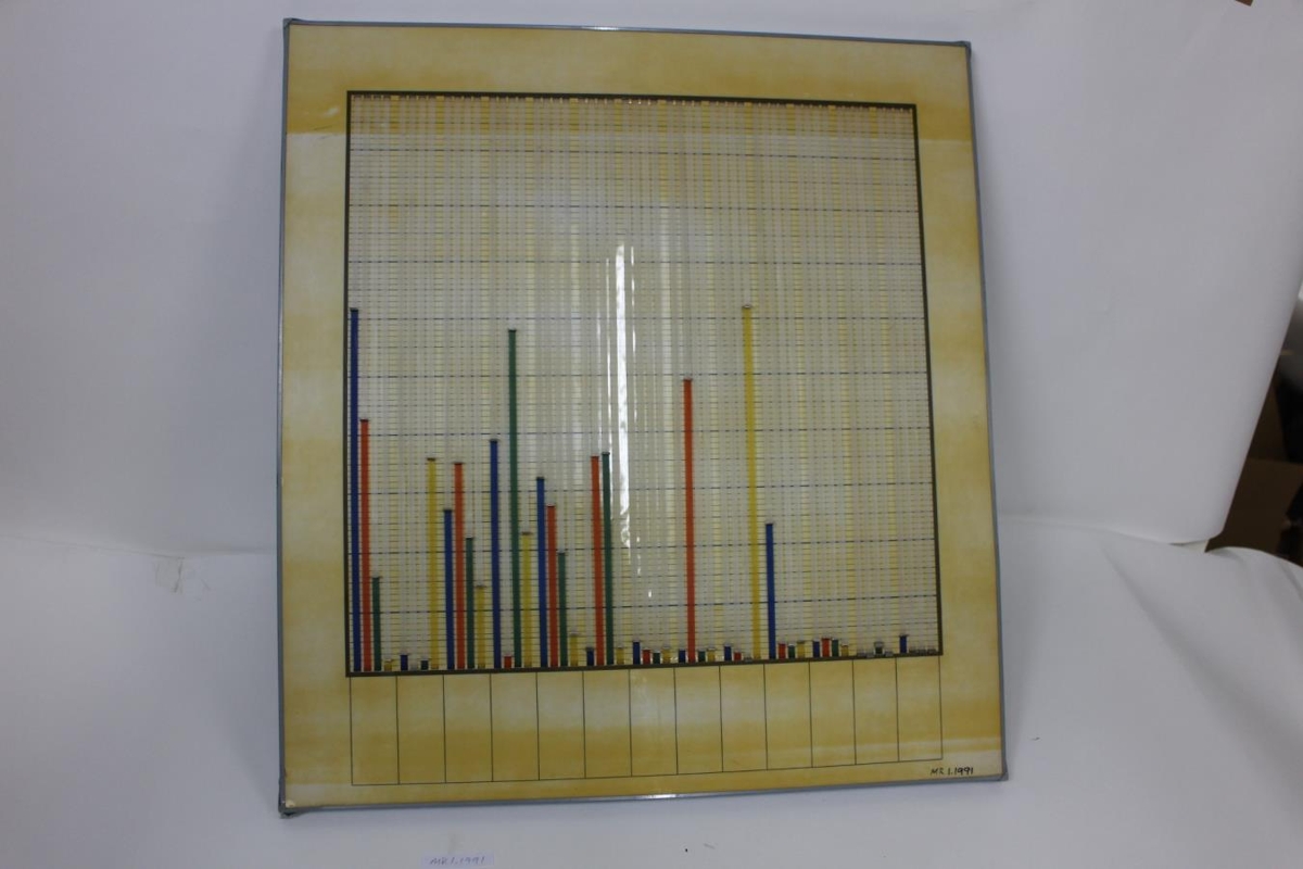 Tafla í ramma, til að hanga á vegg. Hægt að hækka og lækka súlurnar handvirkt. Súlurnar eru með fjórum litum, 4 x 13 talsins. Taflan var notuð til að bera saman árangur í vinheimtu hjá einstökum svæðum RARIK á landinu. Notað fyrir vinheimtubikarinn.